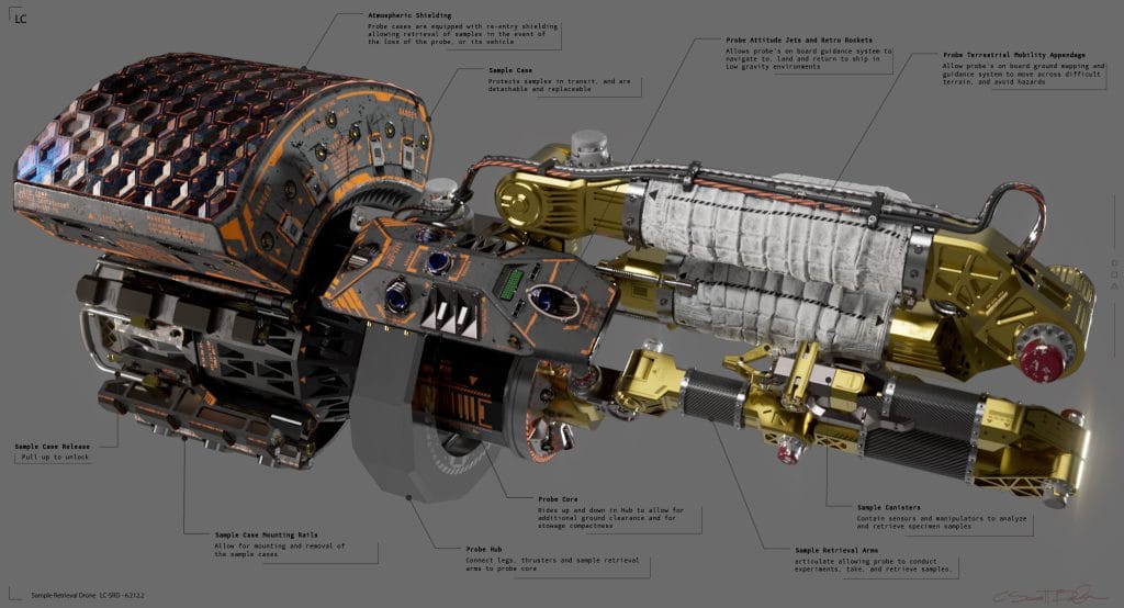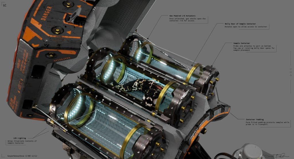 This was a fun and challenging design brief because it went well beyond static scenery. The drone needed to be understood in multiple states: stowed, landing, and actively gathering samples. That meant the design had to incorporate animated behavior alongside modeling, look development, and technical documentation. Being able to show how it worked as a complete system helped secure early buy-in from other departments and kept the design consistent all the way through post.