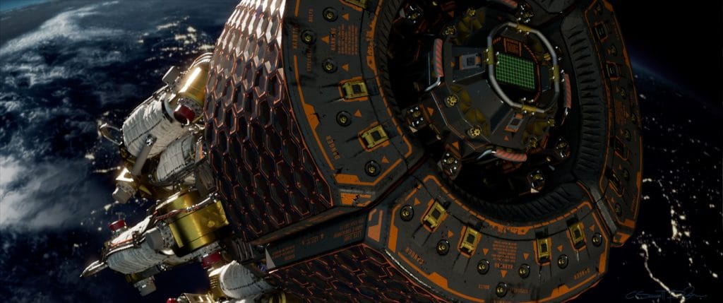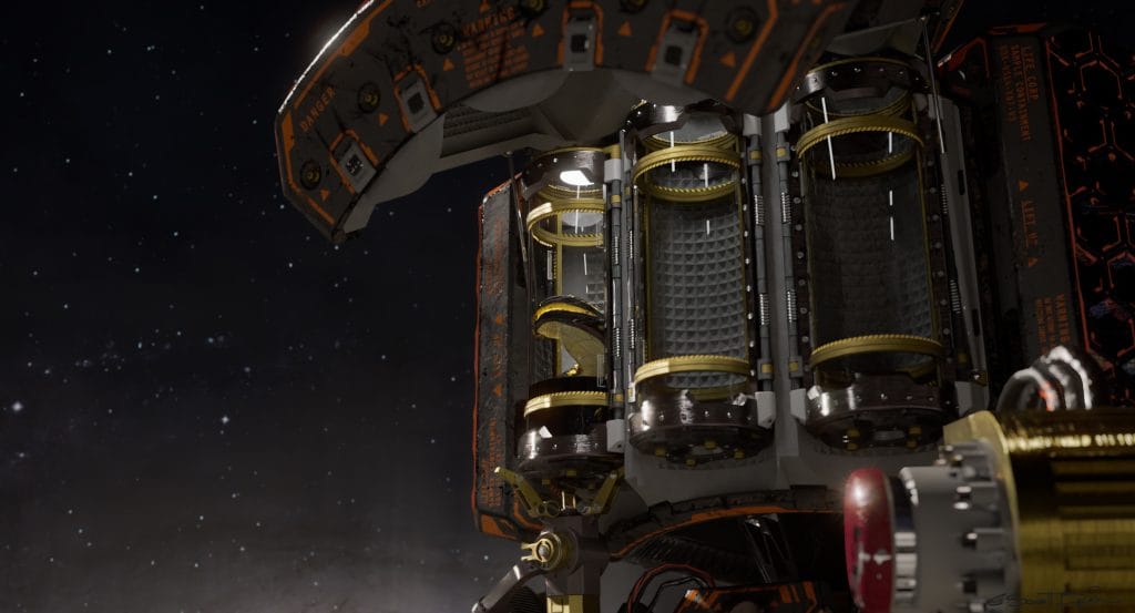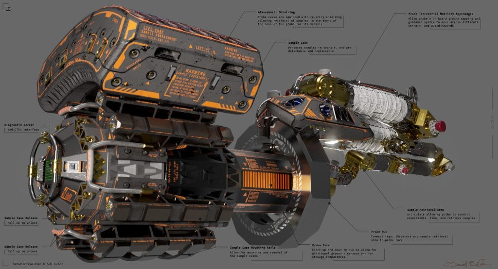 One of my projects for Venom (Sony/Marvel, 2018) was to design an autonomous spider drone and its sample containers. The drone was always intended to be a VFX element, but the containers would be both physical props and digital assets. In the early stages, it’s not always clear exactly how a design will be used, but I’ve found that taking the time to build in functionality and internal logic (especially for sci-fi elements) really pays off. It gives the design a purpose and makes it easier to answer questions that pop up later, like “How does the drone decelerate?” or “How do the canisters detach from the probe?” or even just, “What does this thing do?”